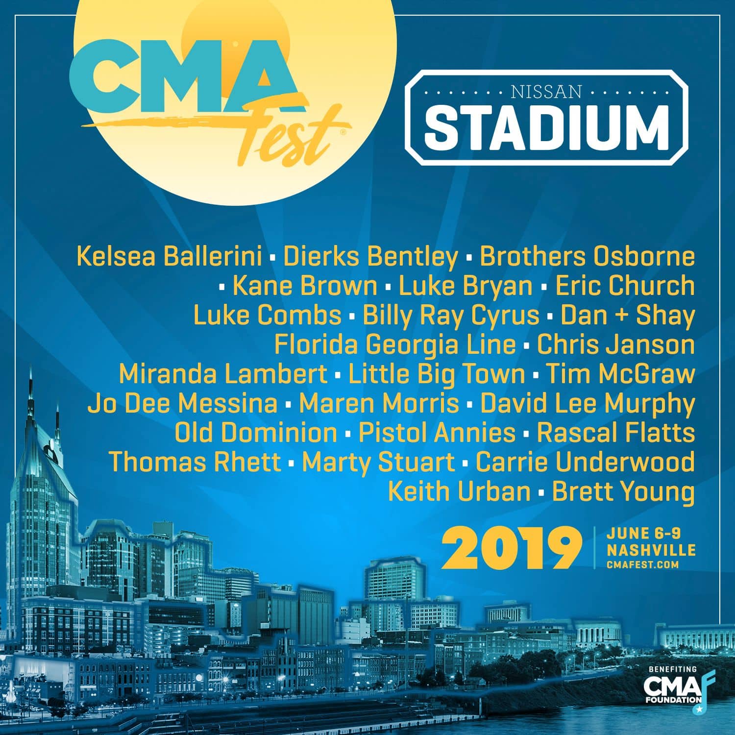 Church joins previously announced Nissan Stadium performers Kelsea Ballerini, Dierks Bentley, Brothers Osborne, Kane Brown, Luke Bryan, Luke Combs, Billy Ray Cyrus, Dan + Shay, Florida Georgia Line, Chris Janson, Miranda Lambert, Little Big Town, Tim McGraw, Jo Dee Messina, Maren Morris, David Lee Murphy, Old Dominion, Pistol Annies, Rascal Flatts, Thomas Rhett, Marty Stuart, Carrie Underwood, Keith Urban, Brett Young, as well as CMA KixStart Artist Scholarship recipients Kassi Ashton, Travis Denning and Jameson Rodgers. Nissan Stadium will open each night with the National Anthem, sung by Nashville School of the Arts (Thursday), Lindsay Ell (Friday), Runaway June (Saturday) and Jimmie Allen (Sunday).